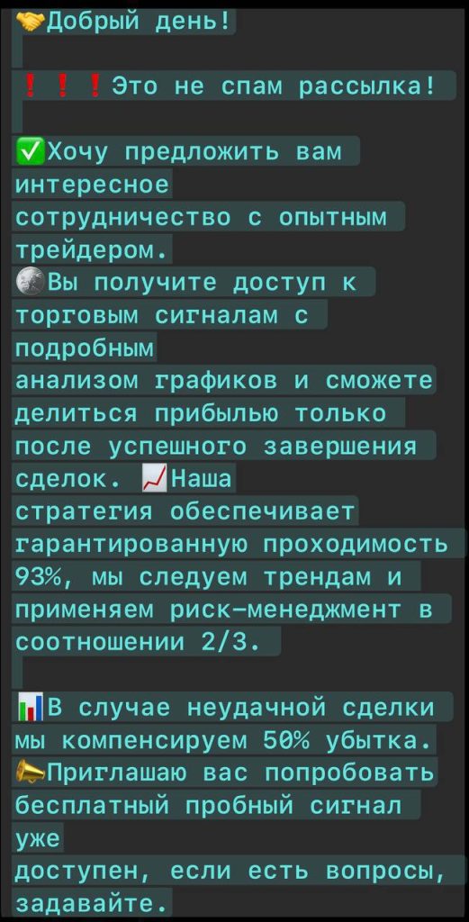 Добрый день! Это не спам рассылка! Хочу предложить вам интересное сотрудничество с опытным трейдером. Вы получите доступ к торговым сигналам C подробным анализом графиков и сможете делиться прибылью только после успешного завершения сделок. Наша стратегия обеспечивает гарантированную проходимость 93%, мы следуем трендам и применяем риск-менеджмент в соотношении 2/3. В случае неудачной сделки мы компенсируем 50% убытка. Приглашаю вас попробовать бесплатный пробный сигнал уже доступен, если есть вопросы, задавайте.