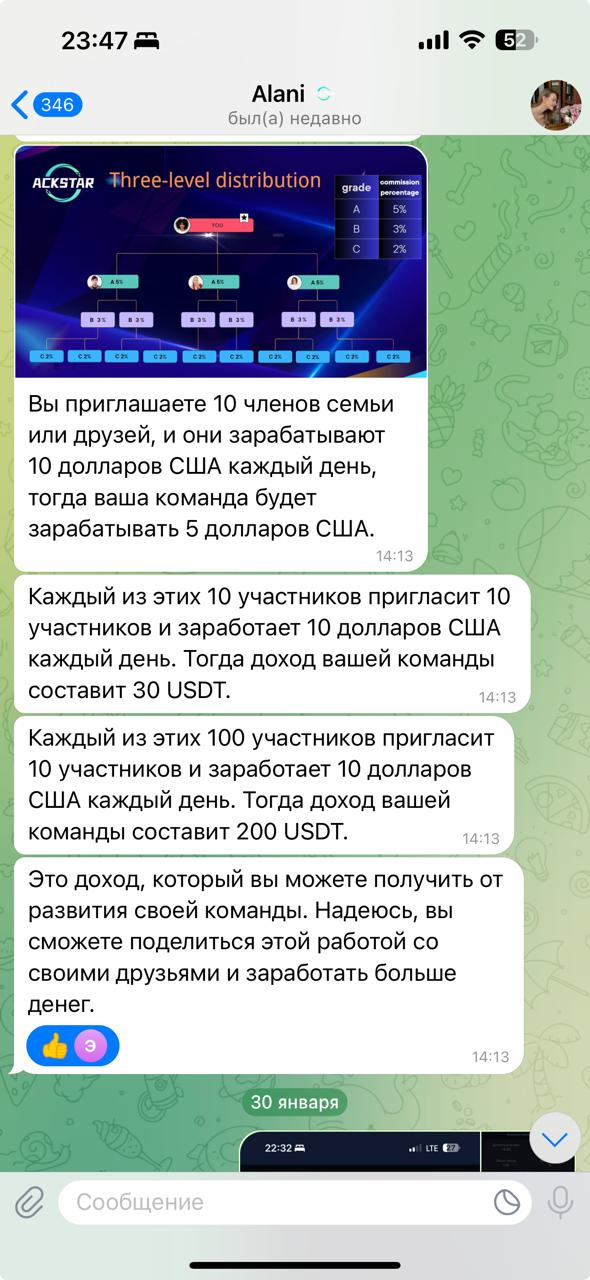 1) Всем привет! Нас только что кинули, мы все вкладывали туда от 50$, и каждый день показывает доходы, один раз успела снять, и поэтому мы еще больше начали верить, всех своих родных подключили, месяц длилось, они работают через биржу битгет и okx, каждый раз пишет одна женщина Алани, мы даже не знаем кто она, каждую неделю ставили цель, типа если зарегистрируете столько то человек, то зп будет, она требовала, чтобы записывали людей, и говорила чтобы мы помогали им тоже.