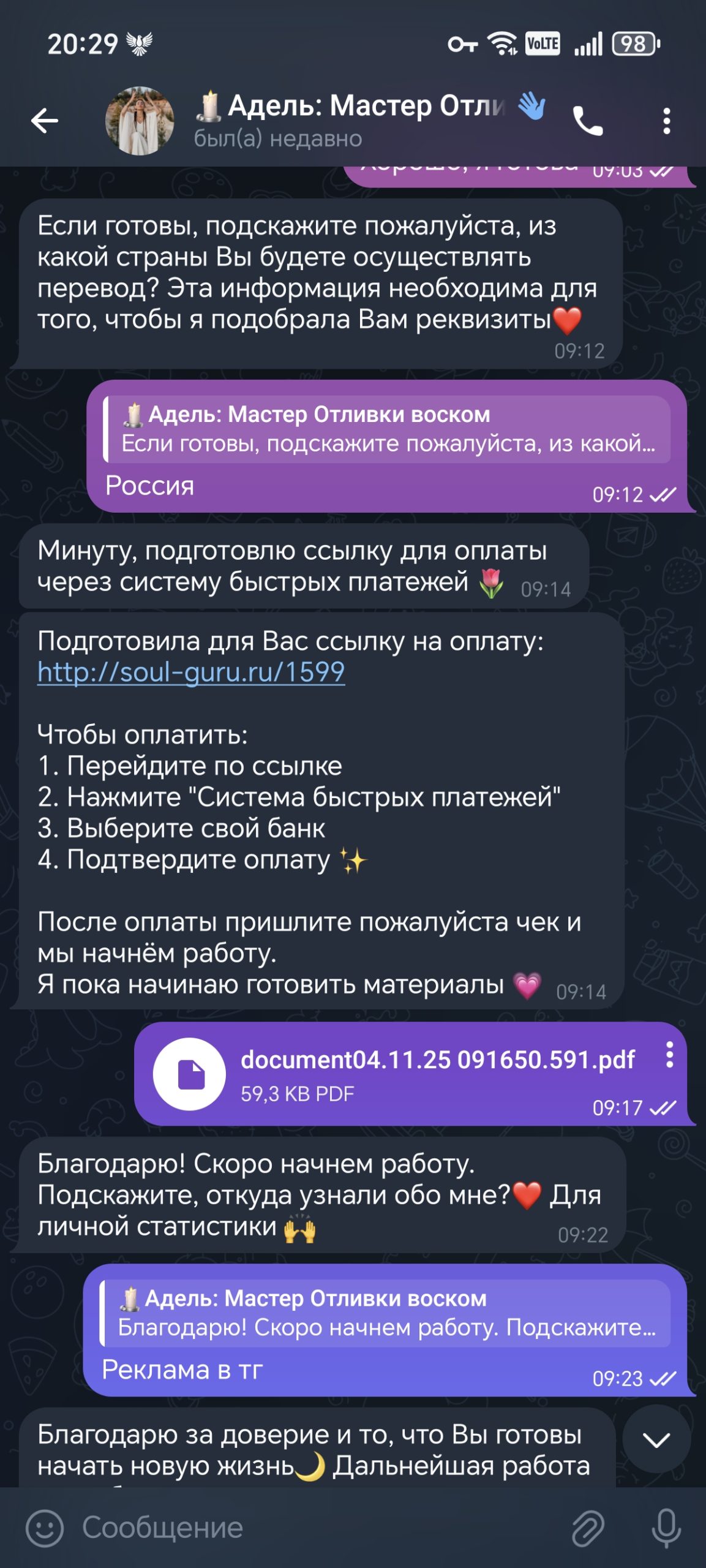Попалась на рекламу в тг, помощь в реализации, личной жизни. На диагностике, многое совпало, что мне сказали, причём быстро за 15мин сделали. Заплатила за полную консультацию и все… Начали морочить голову