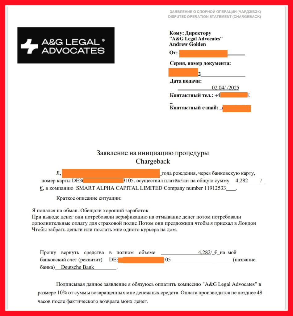 «Наш средний процент успешных чарджбэков превышает 95%, но все зависит от конкретного случая. Мы проводим бесплатный анализ перед тем, как взять дело в работу», — обманывают мошенники.