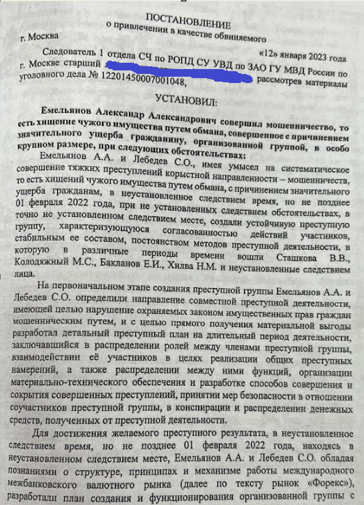 В постановлении от 12 января 2023 года о привлечении в качестве обвиняемого по уголовному делу № 12201450007001048 сказано, что «Емельянов Александр Александрович совершил мошенничество, то есть хищение чужого имущества путем обмана, совершенное с причинением значительного ущерба гражданину, организованной группой, в особо крупном размере, при следующих обстоятельствах: