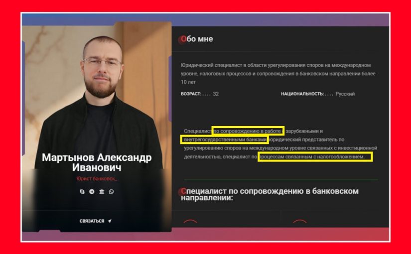 Мошенник использует ТГ @lawyer153, WhatsApp с +7 999 115-39-57. Якобы он специалист по сопровождению в работе с зарубежными и внутрегосударственными банками, юридический представитель по урегулированию споров на международном уровне связанных с инвестиционной деятельностью, специалист по процессам связанным с налогообложением.