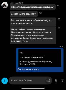Еще он спалился, что имеет доступ к чату с пострадавшими, уверяя, что люди из чата кинули ему скрины моей переписки с якобы другими пострадавшими. По факту ни кто и понятия не имел с каким я юристом работаю. Как они могли ему какие то скрины кидать, да и зачем им это
