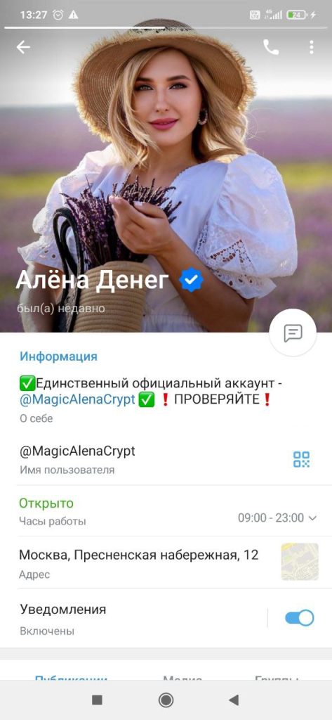 Сейчас у нее чат называется СОКОЛОВА — CHAT, в этом чате все активно переписываются и делятся скринами успешных торгов, а личный профиль куда она говорит писать «Катерина»