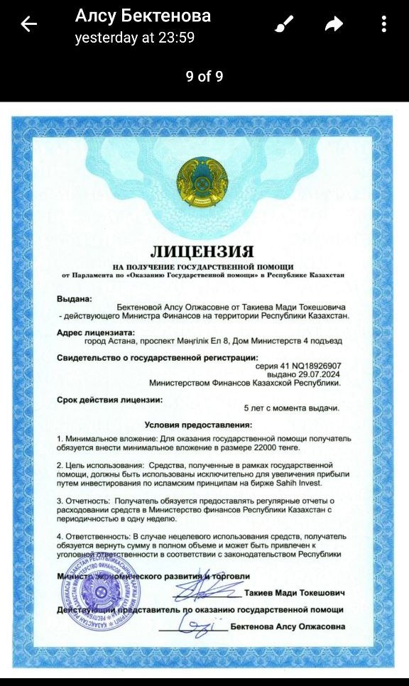 1) Здравствуйте! На Телеграмм в РК появилась Алсу Бектенова (может быть дочь нашего премьера) зазывает на лёгкие заработки, попросил разрешающие документы, выслали лицензию, но она очень подозрительная .