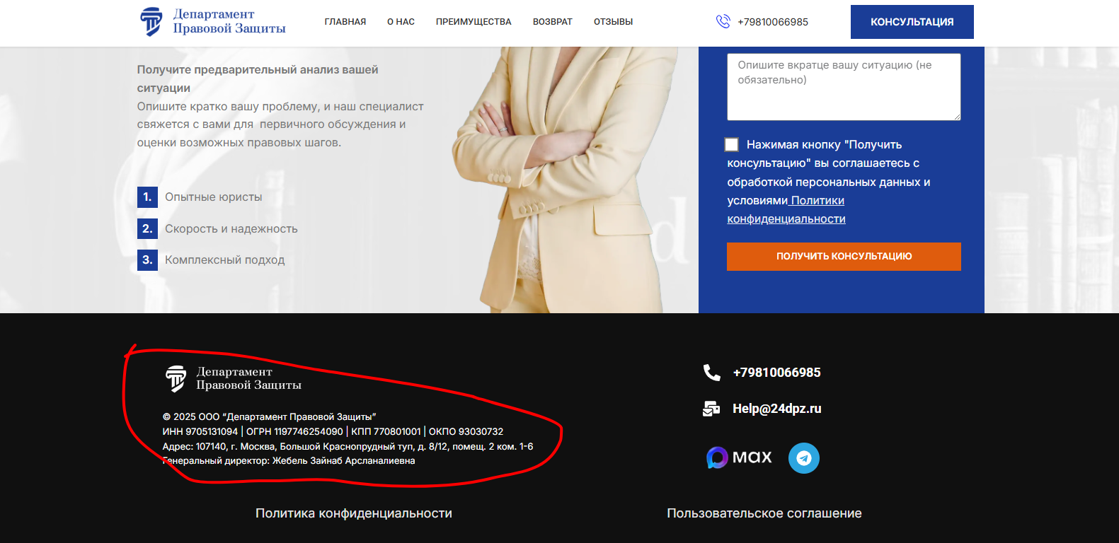 ООО “Департамент Правовой Защиты”. ИНН 9705131094 | ОГРН 1197746254090 | КПП 770801001 | ОКПО 93030732. Адрес: 107140, г. Москва, Большой Краснопрудный туп, д. 8/12, помещ. 2 ком. 1-6