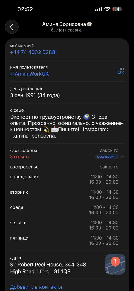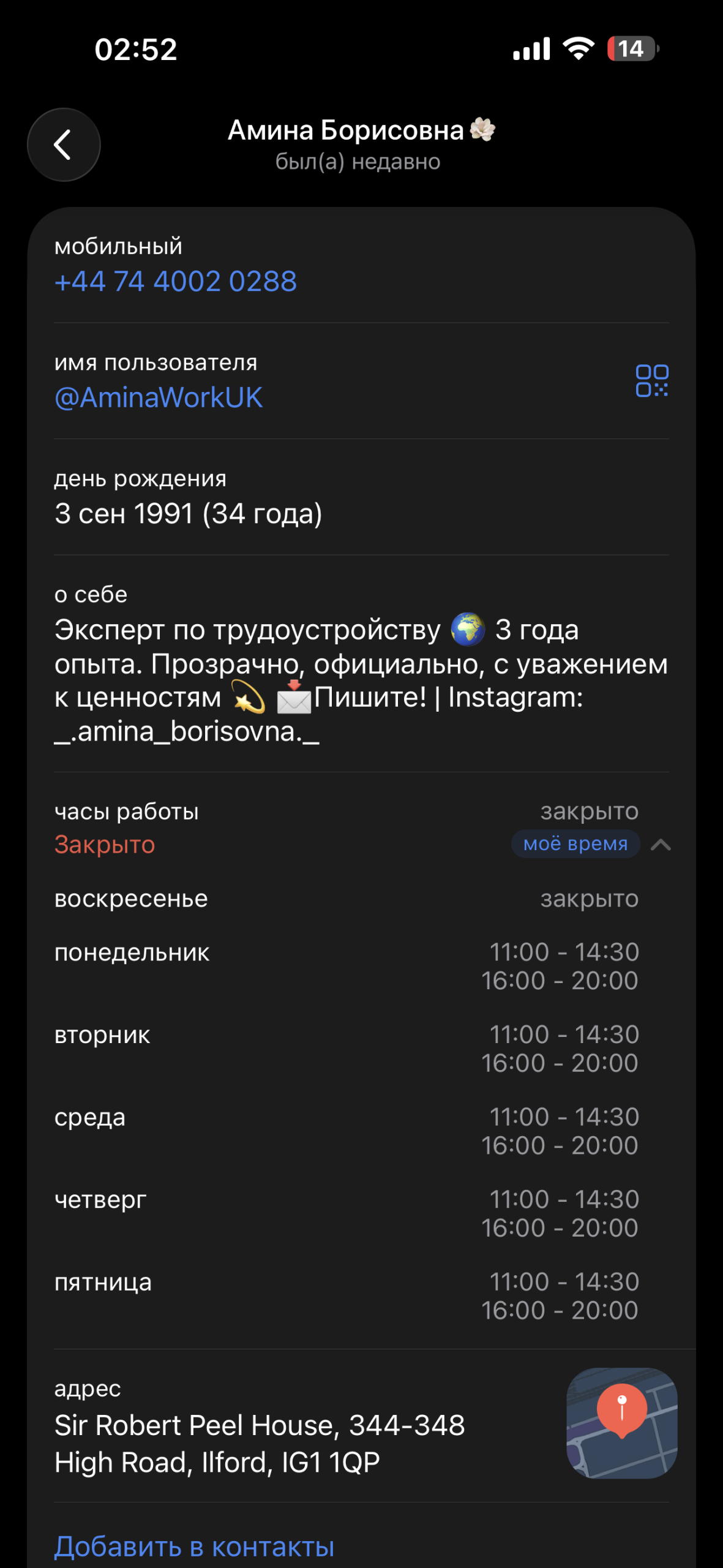 — О себе: Эксперт по трудоустройству с 3-летним опытом. Прозрачно, официально, с уважением к ценностям. Пишите!