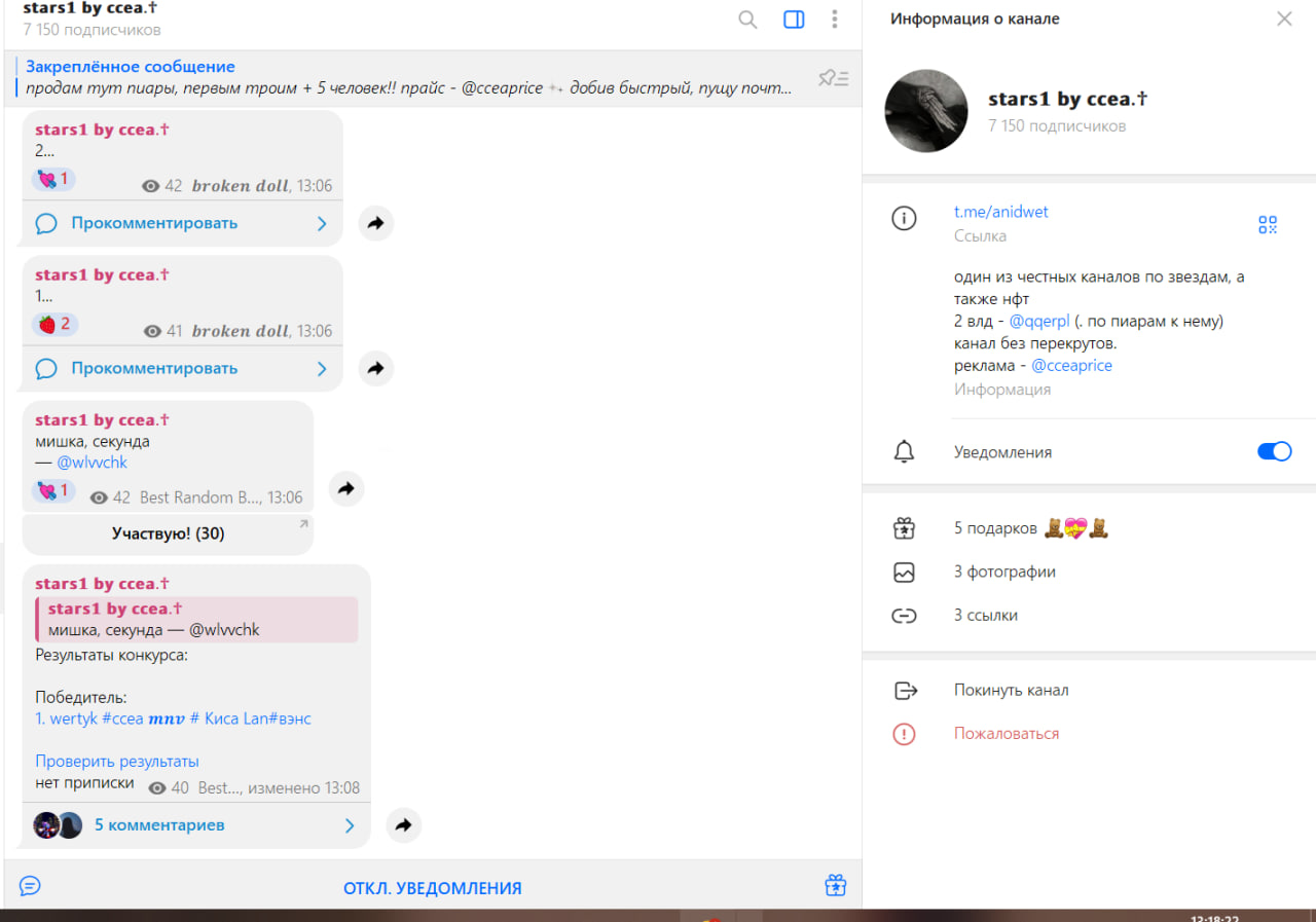 обнаружила скам тгк по звездам. якобы пишешь первым под пост, и тебе скидывают мишку или сердечко за 15 зв. отписать надо за 1 мин. приз не выдают уже 3ий день. владелец просто читает чат и не отвечает.