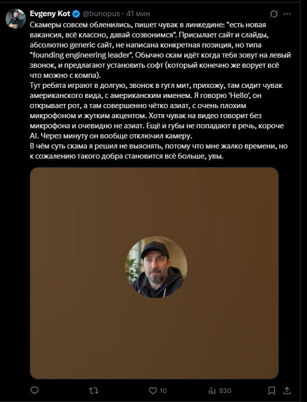 Скамеры совсем обленились, пишет чувак в линкедине: «есть новая вакансия, всё классно, давай созвонимся». Присылает сайт и слайды, абсолютно generic сайт, не написана конкретная позиция, но типа «founding engineering leader».