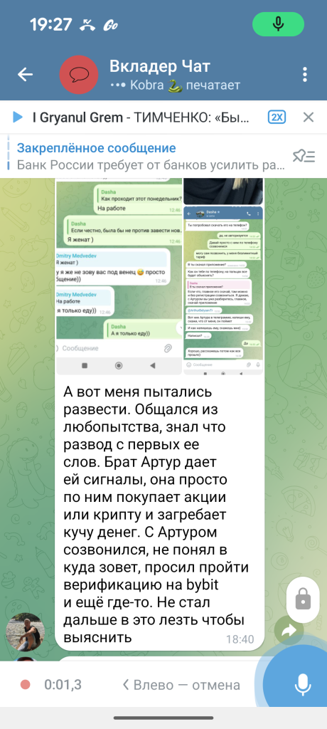 А вот меня пытались развести. Общался из любопытства, знал что развод с первых ее слов. Брат Артур дает ей сигналы, она просто по ним покупает акции или крипту и загребает кучу денег.