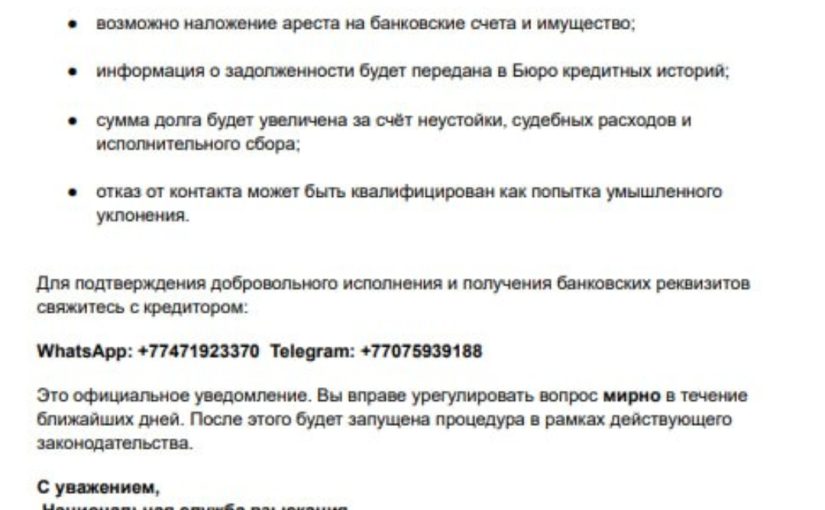 После «регестраци» на данном сайте не какие Ваши данные не отображаются что счёт действительно принадлежит вам. Чтобы пройти идентификацию и вывести деньги запрашивает ту или иную сумму (как я позже выясняла) в моем случае 60000. В этот момент я уже поняла что это машейники и прекратила контакт. Однако спустя месяц мне с этого же контакта в Телеграмм прислали якобы письмо о том что я вышла на просрочку и должна урегулировать вопрос. Начинается психологическое давление. Что приедут домой напишут письмо на работу. Однако по факту не каких денег я не получала. Расписка написанная насколько я знаю не имеет юридической силы т.к данных кредитора кроме ФИО не имеется. Так же проконсультировавшись с юристом сказал мне что я везунчик что просто нужно заблокировать данный контакт. И больше не подать в такие ситуации. Так же нашла в интернете людей которые находясь в тяжёлой сетуации попались на эти уловки. Головой понимаю что по факту все это машейнтчестно но кто как решил этот вопрос не кто не даёт ответа.