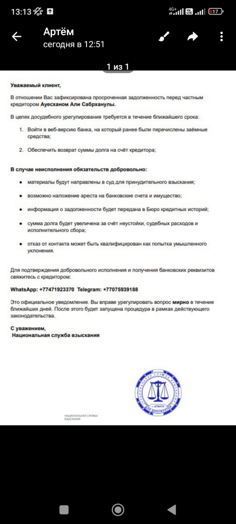 Машейник. Якобы предлагает выгодный частный кредит на карту любого банка по расписку номер +77471923370 WhatsAPP. После того как вы пересылаете расписку, делает перевод средств на карту nova-pay.pw непонятного банка который находится в Вене.