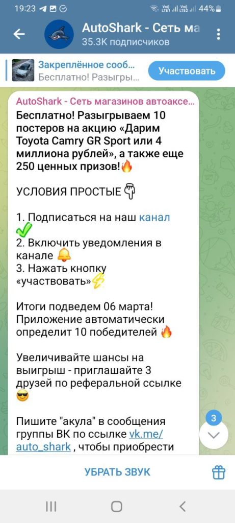 Бесплатно! Разыгрываем 10 постеров на акцию «Дарим Toyota Camry GR Sport или 4 миллиона рублей», а также еще 250 ценных призов! УСЛОВИЯ ПРОСТЫЕ 1. Подписаться на наш канал 2. Включить уведомления в канале 3. Нажать кнопку «участвовать» Итоги подведем 06 марта! Приложение автоматически определит 10 победителей Увеличивайте шансы на выигрыш приглашайте 3 друзей по реферальной ссылке Пишите "акула" в сообщения группы ВК по ссылке vk.me/auto_shark, чтобы приобрести