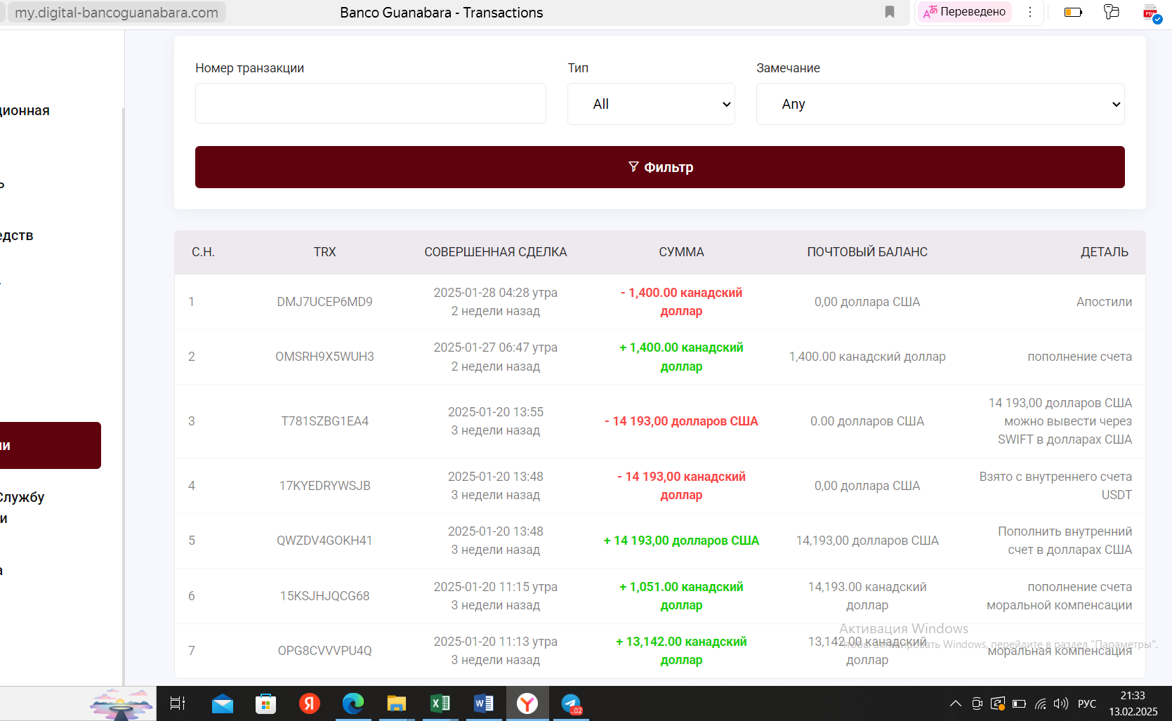 Соответственно после него происходит еще один денежный перевод на карту физ лица около 140 000 т.р После чего снова приход извещение от банка: