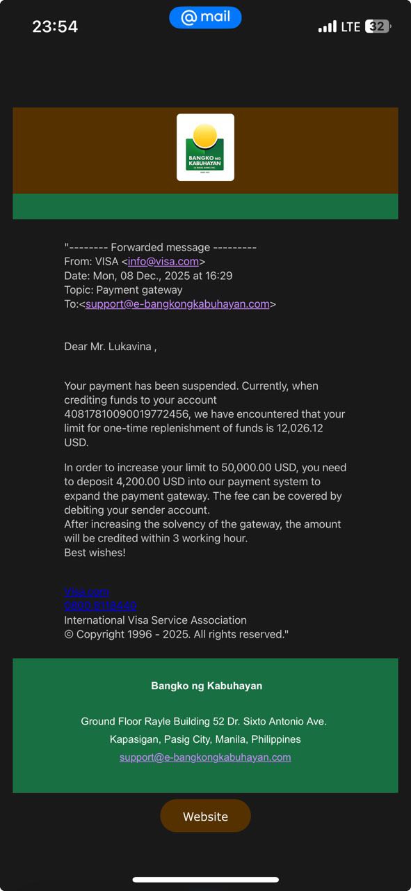 Потерял деньги в брокерской Компании, со мной связались юристы и мы открыли счет в Bangko Kabayan и меня обманули на 500 000 руб. , вечные оплаты, была группа в телеграм где сидели типа такие потерпевшие. Как я понял это были те же юристы.