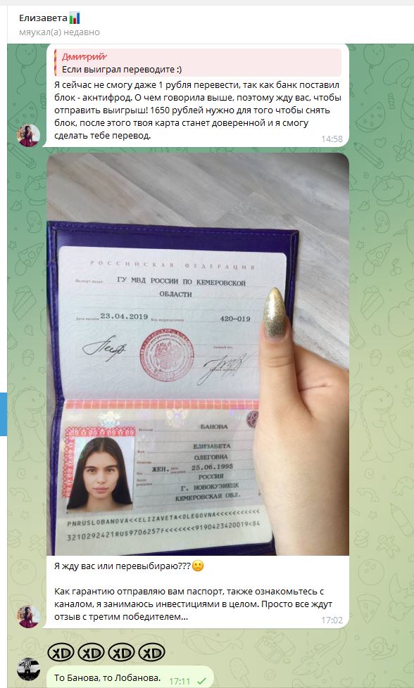 Но что бы прислать их мне, написала сказку про банки и что нужно отправить 1% от выигрыша :))))))))