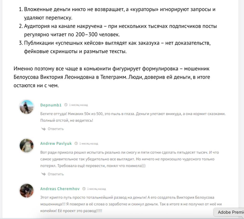 2) Виктория Белоусова. Выманивает деньги у неопытных доверчивых людей, обещая крупное денежное вознаграждение 50 тыс руб за инвестиции 500 рублей. Сначала инвестиция 500 руб, потом страховка 5000 руб, потом страховой взнос 6500, затем лицензия 14200 руб… Все признаки мошенничества. Пострадавших огромное количество. Просьба принять меры.