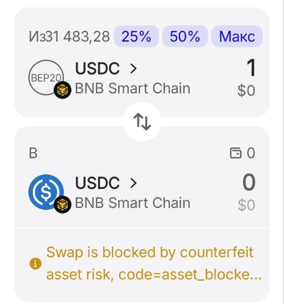“Swap is blocked by counterfeit asset risk, code=asset_blocked…”