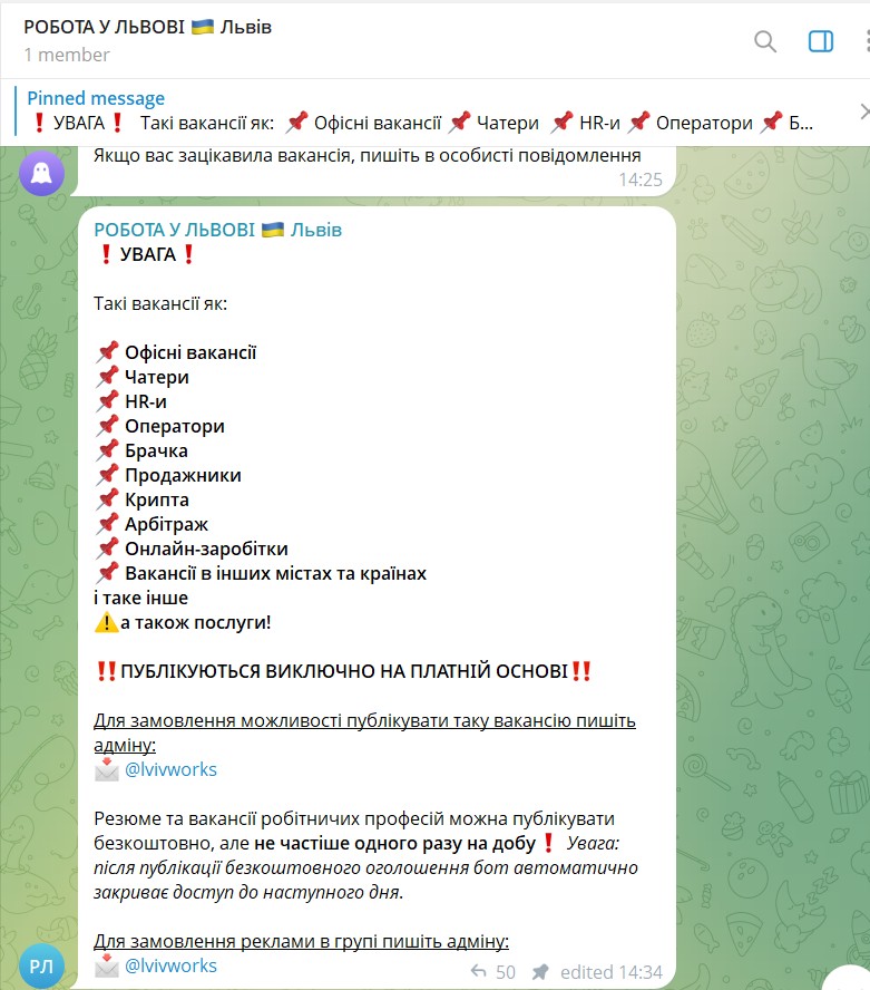 Хочу поділитись досвідом про відкрите шахрайство та обман компаній, які розміщують свої вакансії в группі РОБОТА У ЛЬВОВІ https://s.w.org/images/core/emoji/17.0.2/svg/1f1fa-1f1e6.svg Львів (Розміщення реклами в групі @lviv_robota) https://t.me/lviv_robota/9078 Ця компанія має максимально не професійного адміна, який не вміє спілкуватись з клієнтами і не розуміє, що вони порущують закон по правам споживачів та надання послуг. Ця компанія надає послуги і написала в своїх правилах, що в группі робітничі вакансії розміщуються 1 раз безкоштовно. Але на практиці цієї умови немає, так як це капкан для роботодавців. Заманити та виманити гроші. Попросила аналітику і статистику для Комірника. Але адмін почав грубити, не ввічливо спілкуватись і с сарказмом писати де такий закон, що вони мають чогось дотримуватись. Я почала пояснювати, що закон один для всіх і якщо вони обманюють компанії то і оплачені послуги можуть забрати так само. Адмін після мого попередження, що я буду скаржитись на них і спекулювати у період війни це погано. Адміна нік в телеграм: @lvivworks Будьте обережні, бо в цій группі працюють не професійні люди і не слідують закону.