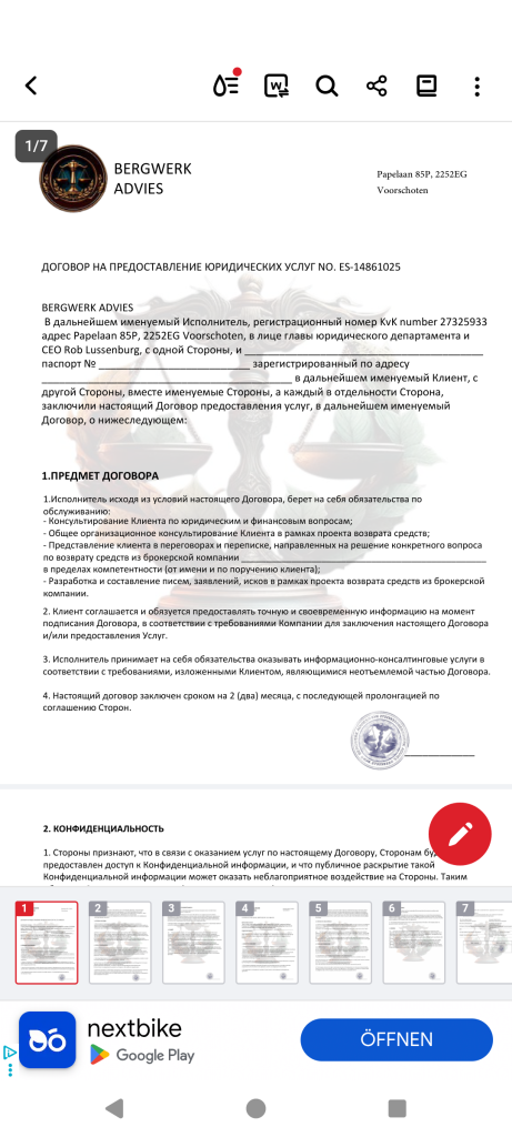 Я хотел бы спросить у вас можно ли доверять юридической фирме BERGWERK ADVIES по возрату средств от брокера мошенника, они со мной связались и сейчас вопрос идёт о сотрудничестве по этому вопросу, но я хотел спросить вначале у вас можно ли им доверять перед тем как подписывать контракт.