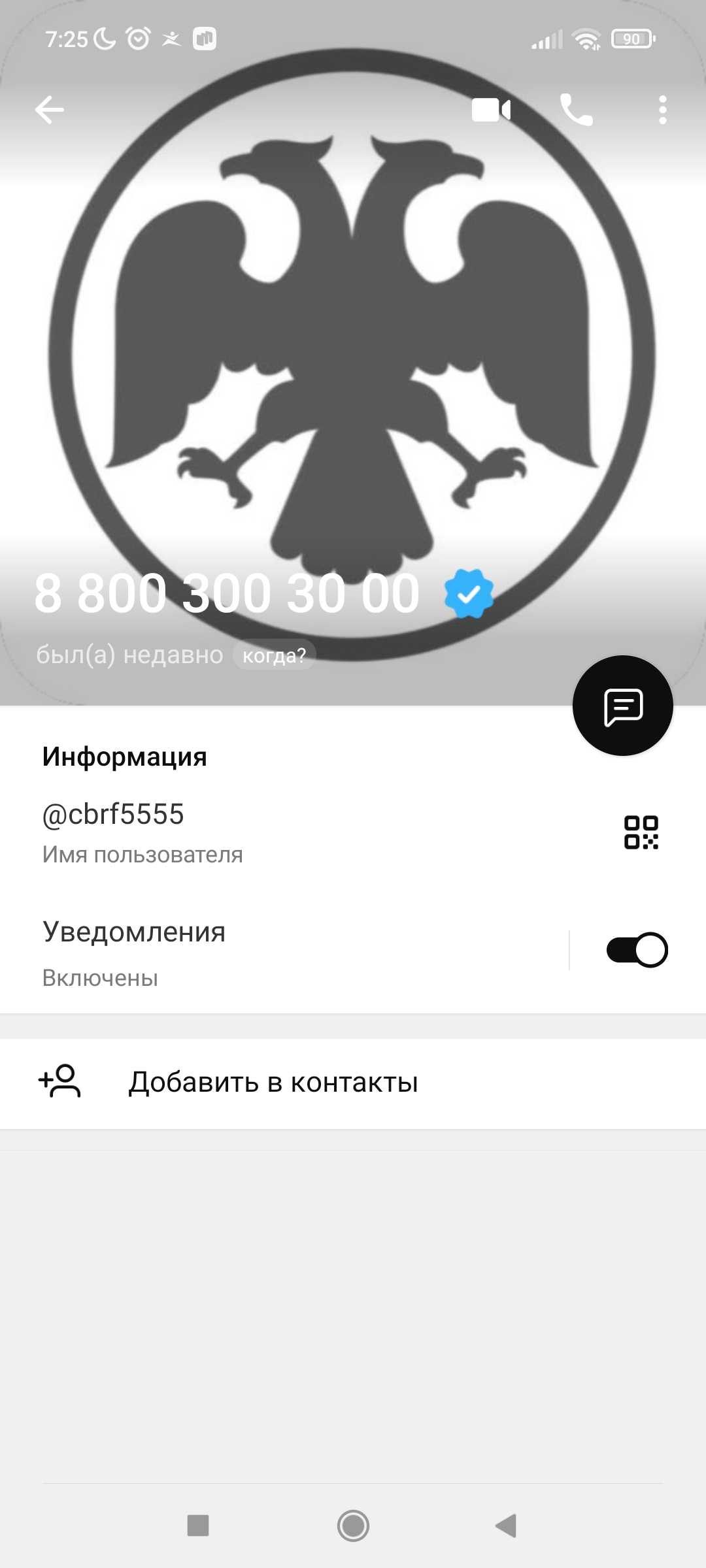 Если вас просят позвонить или написать «центральному банку» в телеграмме, то знайте, что это мошенники. Пример мошеннического аккаунта в телеграмм @cbrf5555