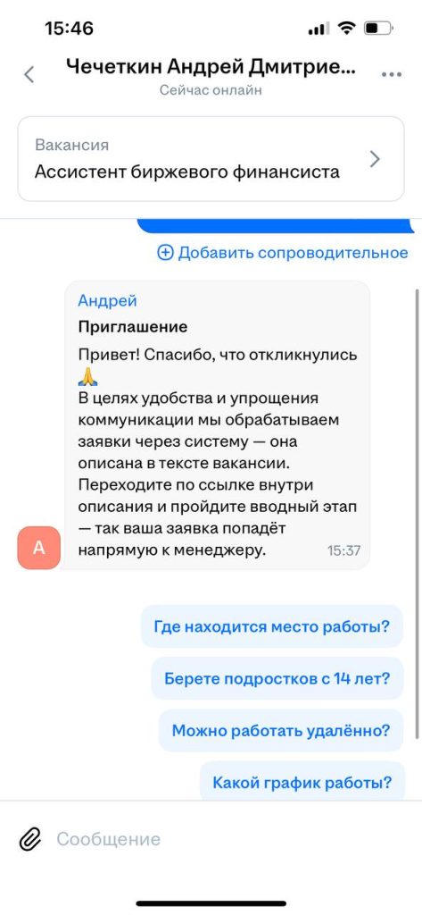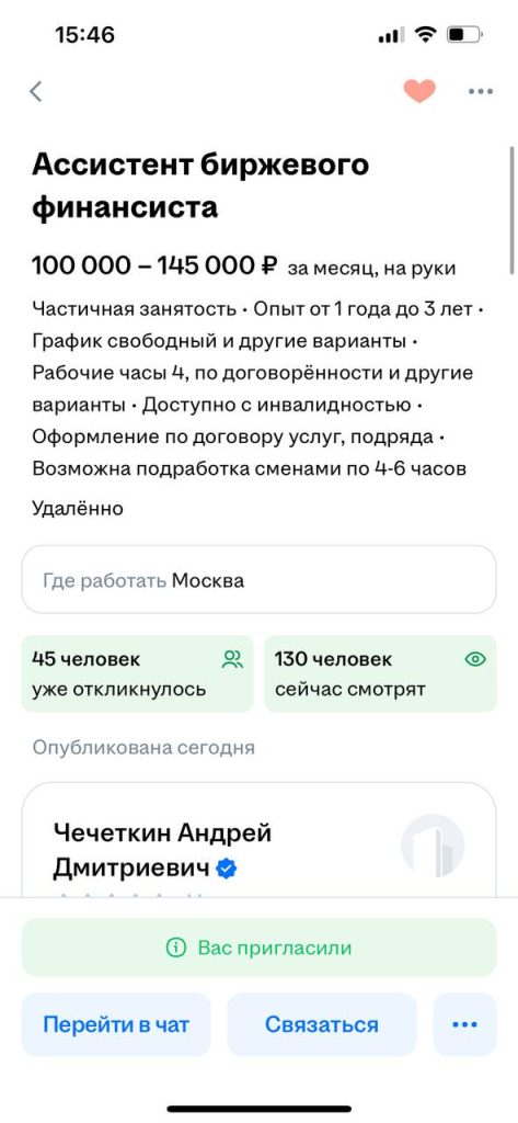 По внешним признакам вакансии от «Андрея Чечеткина» речь может идти о фальшивой вакансии, с помощью которой людей заманивают на «обучение», а потом вовлекают в игру на поддельных площадках, где их деньги сгорают.