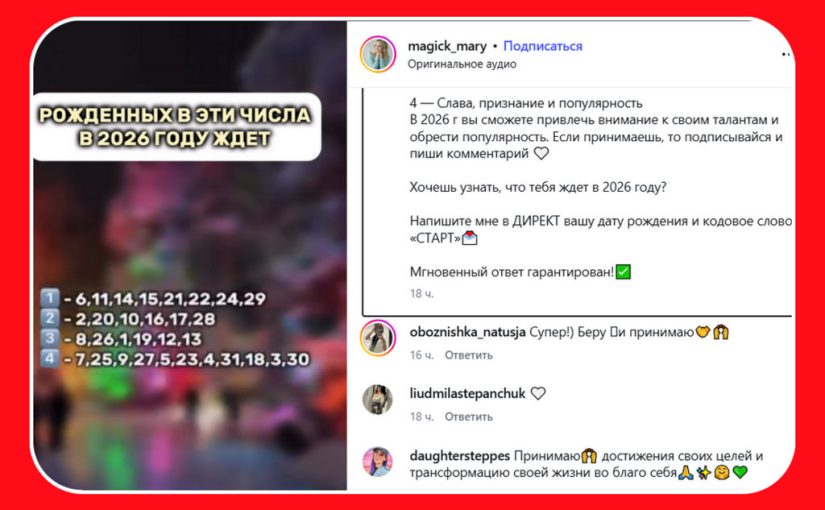 «В 2026 г вы сможете привлечь внимание к своим талантам и обрести популярность. Если принимаешь, то подписывайся и пиши комментарий. Хочешь узнать, что тебя ждет в 2026 году? Напишите мне в ДИРЕКТ вашу дату рождения и кодовое слово «СТАРТ». Мгновенный ответ гарантирован!», — так заманивает глупых женщин мошенница.