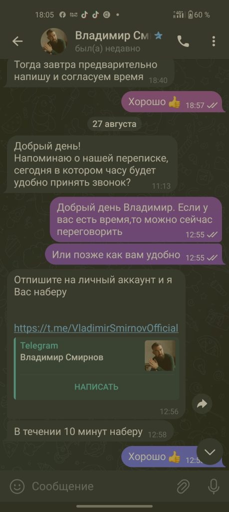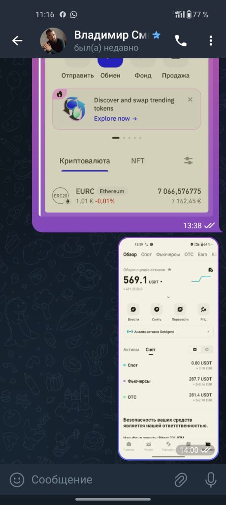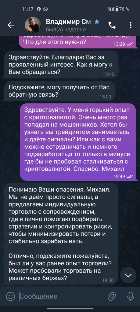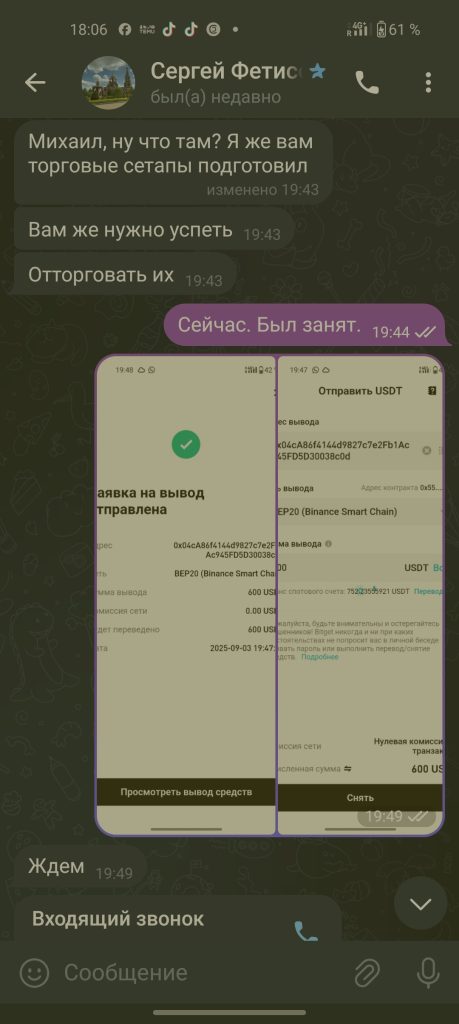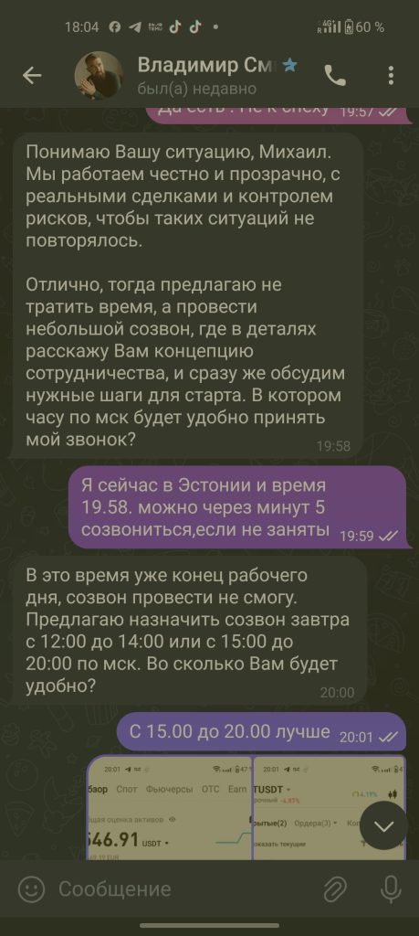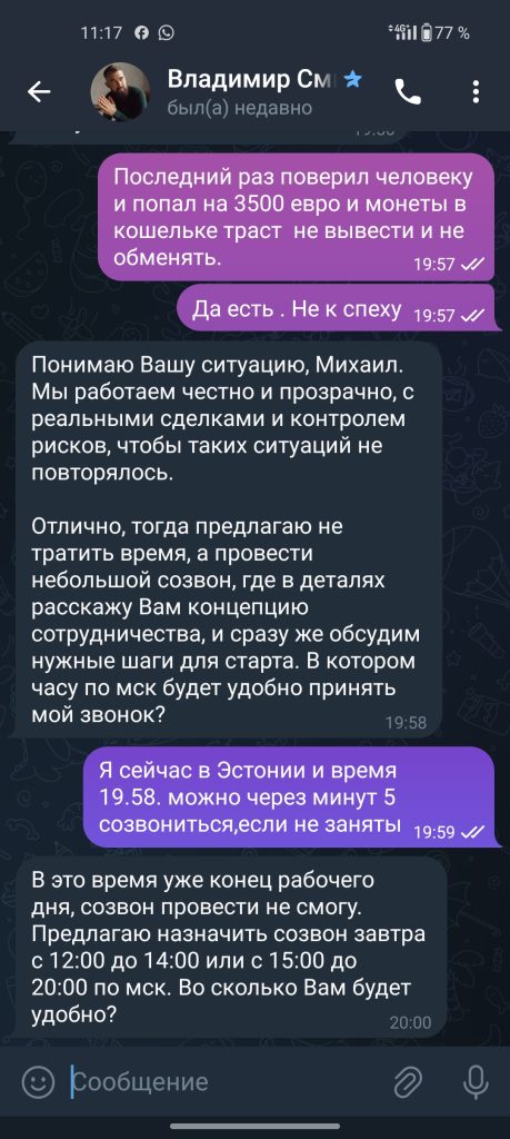Здравствуйте. Пострадал на 1200 usdt от Владимир Смирнова ,каторый перевёл на Сергея Фетисова и дальше по схеме зарегистрировался на платформе connect-api-system.com, подключил в своём кошельке BNB смарт контракт и автоматически мои usdt отобразились на платформе,где сумма росла и когда мне вывели первый раз 9 usdt всё прошло хорошо деньги пришли,а когда всю сумму запросил на вывод то запросили комиссию за вывод gas. Будьте осторожны с этими мошенниками. Прикрепляю доказательства: