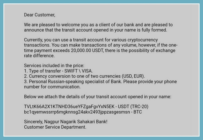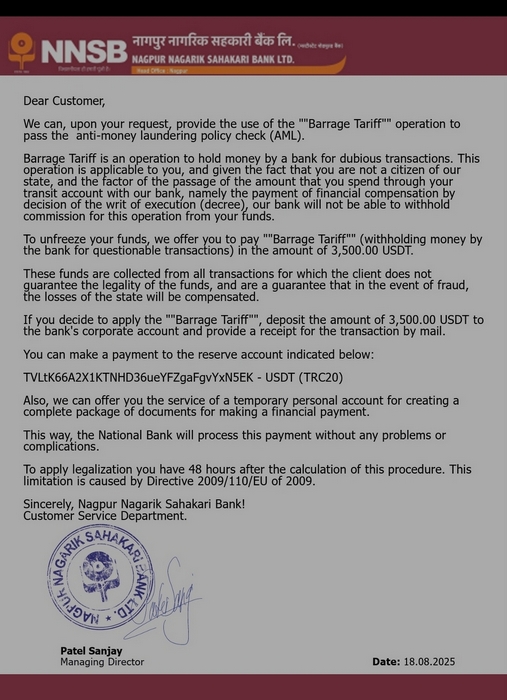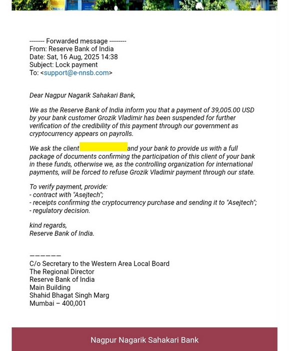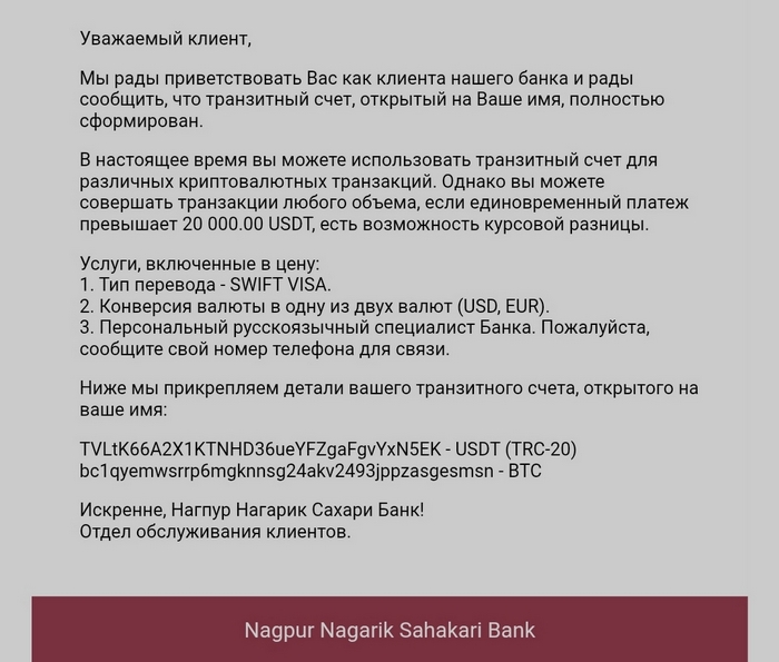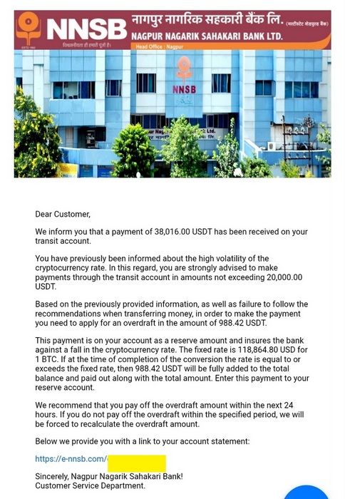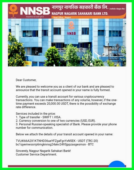 Задействован и фальшивый, якобы индийский банк Nagpur Nagarik Sakahari Bank (e-nnsb.com), который вымогает деньги в USDT, а не в рупиях. Присутствует и Резервный банк Индии.