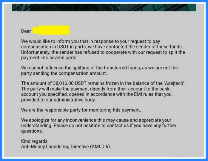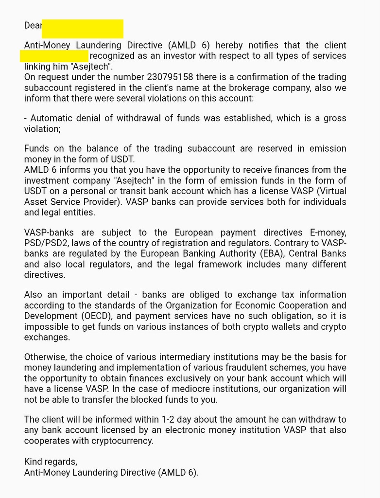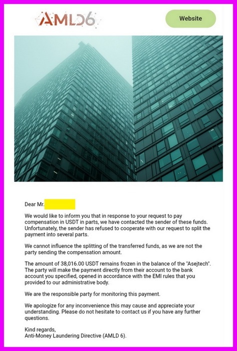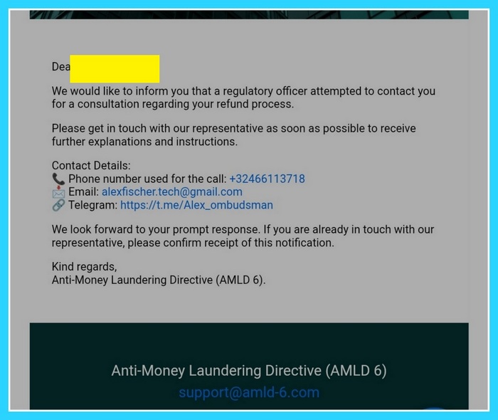 В разводе участвует фальшивый регулятор, названный как документ Евросоюза: Anti-Money Laundering Directive, AMLD 6, +32466113718, alexfischer.tech@gmail.com, @Alex_ombudsman (account.amld-6.com)