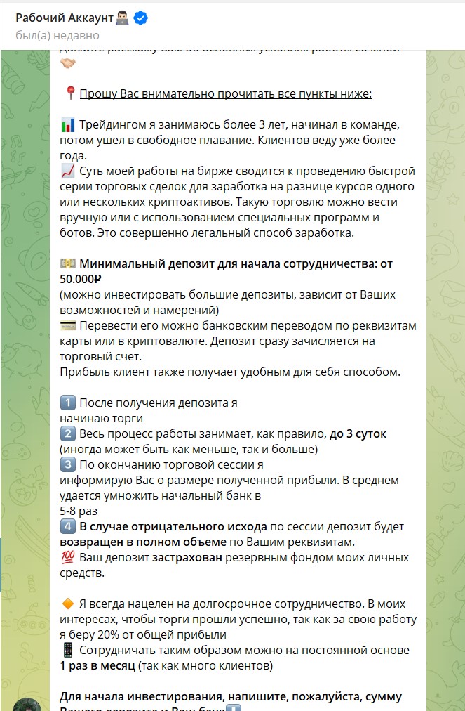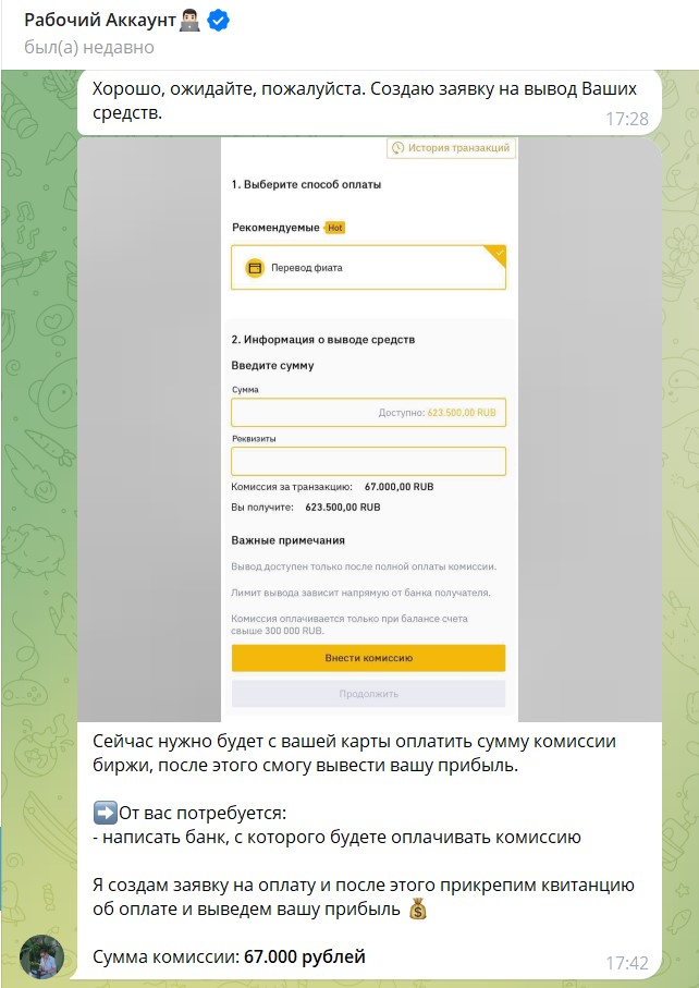 Все начинается с вводного смс об условиях сотрудничества, вход 50 тысяч минимум. Процесс длится 1-3 дня, в процессе скидываются левые скрины с биржи об активной деятельности, после успешный успех все готово, но нужно оплатить еще комиссию.