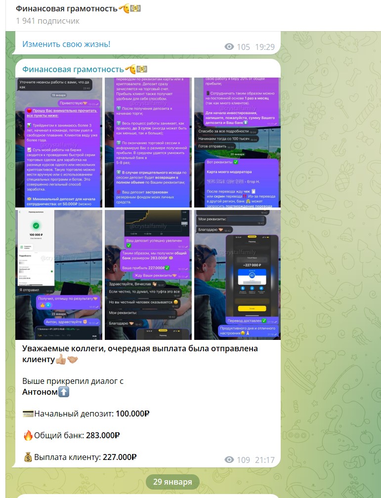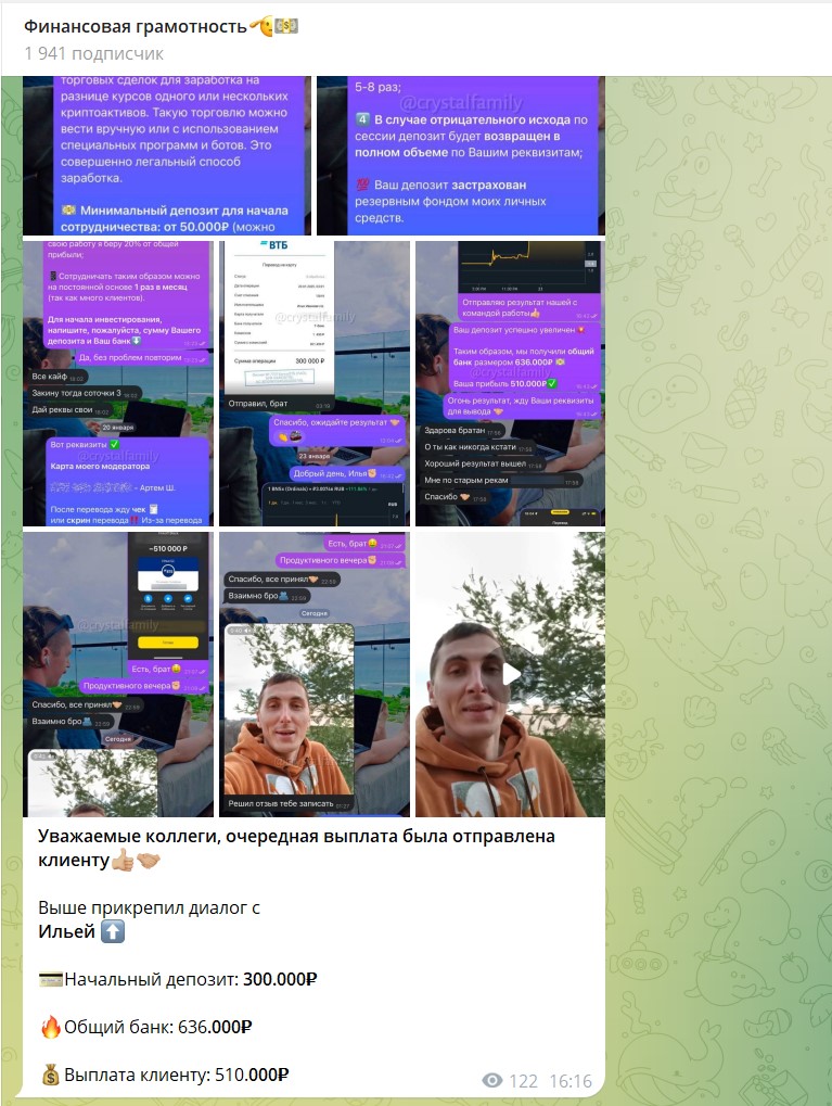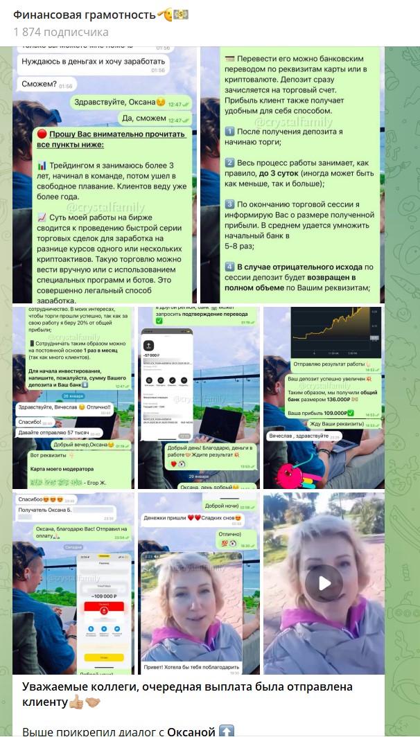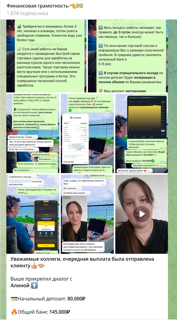 Закрытый канал «Финансовая грамотность», связное лицо телеграм: @crystalfamily полный успешных кейсов торгов и восторженных отзывов, объявления о наборах групп на сотрудничество, всевозможная агитация уже инвестировать.