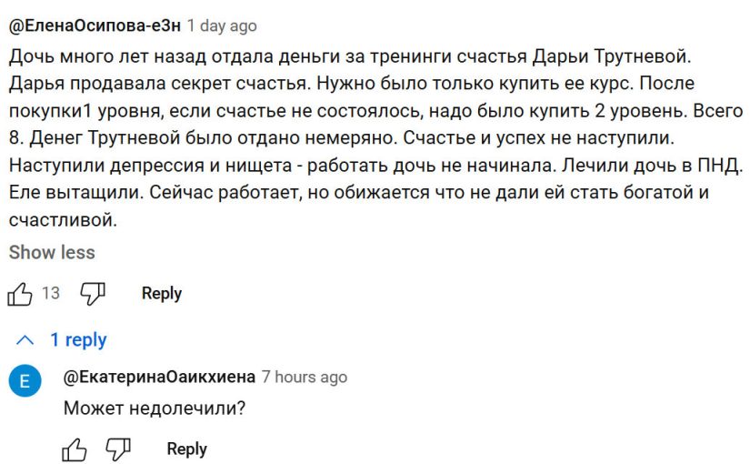 Дочь много лет назад отдала деньги за тренинги счастья Дарьи Трутневой. Дарья продавала секрет счастья. Нужно было только купить ее курс. После покупки1 уровня, если счастье не состоялось, надо было купить 2 уровень. Всего 8. Денег Трутневой было отдано немеряно. Счастье и успех не наступили. Наступили депрессия и нищета — работать дочь не начинала. Лечили дочь в ПНД. Еле вытащили. Сейчас работает, но обижается что не дали ей стать богатой и счастливой.