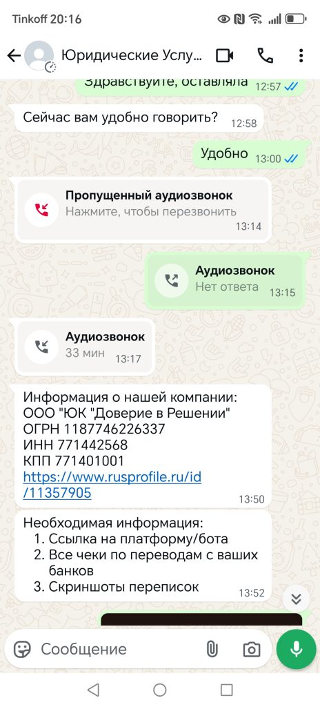 6) После моего письма на сайте «Стоп-скам» мне позвонил человек, представился юристом из компании ООО ЮК «Доверие в решении». Обещает вернуть потерянные средства. Необходимо заключить договор, в котором на открытие счета нужно будет внести 605 Евро. Не смог найти в интернете телефон этой компании. Можно узнать, работает ли у них Тиханин Роман или это мошенник?