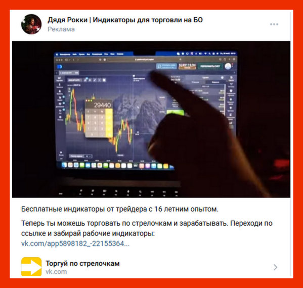 В ВК рекламируют группу «Дядя Рокки | Индикаторы для торговли на БО» (vk.com/unclerockyofficial)