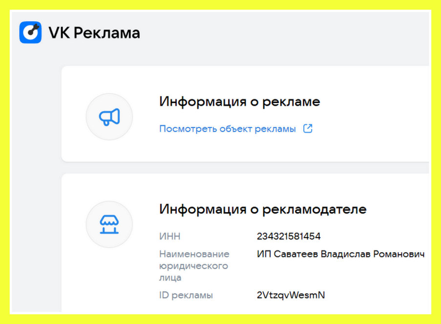 Информация о рекламодателе ИНН 234321581454, ИП Саватеев Владислав Романович, ID рекламы, 2VtzqvWesmN