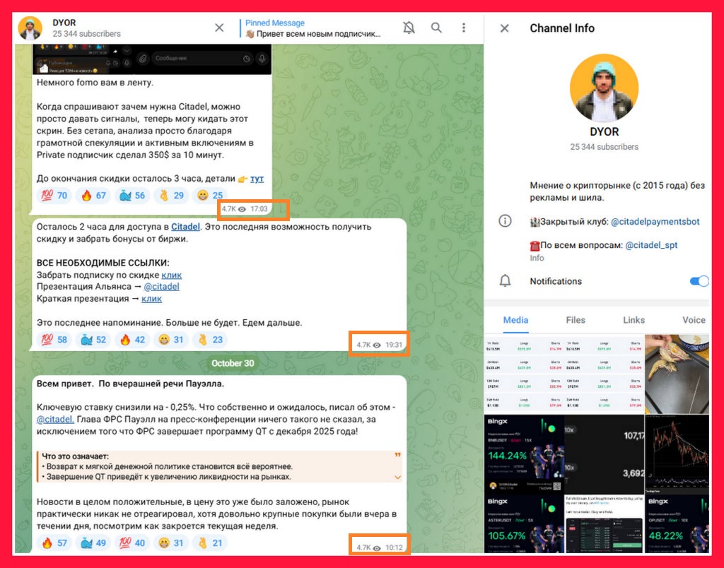 Подобные каналы для создания доверия накручивают подписчиков и просмотры. В этом легко убедиться, так как число просмотров у постов примерно одинаковое, чего в живых каналах не наблюдается:
