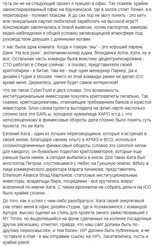 Евгений Хата — один из лучших переговорщиков, которые я встречал в своей жизни. Благодаря своему опыту в KPMG и BCG, используя сложноподчиненные финансовые обороты (словно это common sense для каждого), он буквально подкупал криптоаматоров, которые еще раньше были никем, а сегодня выбились в князи. Для таких Хата был апостолом Петром, спустившимся с Небес на Грешную землю. Bitfury в лице коммерческого директора Марата Кичикова, представитель Ethereum Alliance Влад Мартынов, статусные институциональные инвесторы, владельцы бирж, посредники — все крутились вокруг вселенной по-имени Хата. С таким арсеналом не собрать деньги на ICO было крайне сложно…