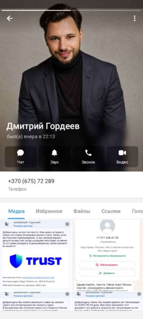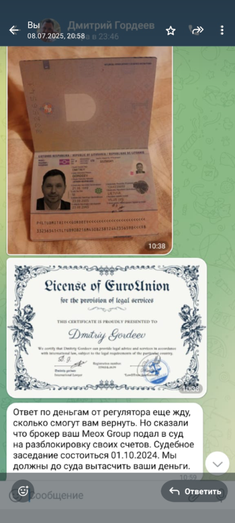 Появляется спаситель. Человеку пишет некий «Дмитрий Гордеев», показывает красивый профиль, иностранный номер, фото паспорта, липовую «лицензию», чтобы создать доверие.