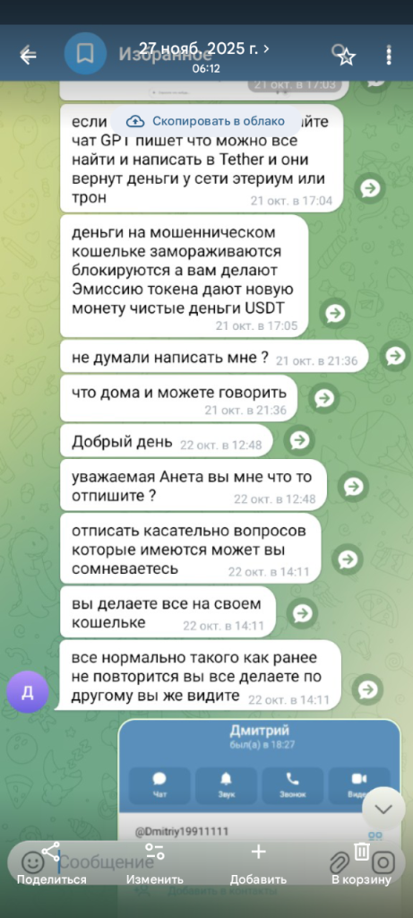 это не схема возврата денег, а схема «дожима» жертвы после первого мошенничества. У человека, который уже потерял деньги, выманивают новые суммы под видом юридического, банковского и криптовалютного сопровождения.