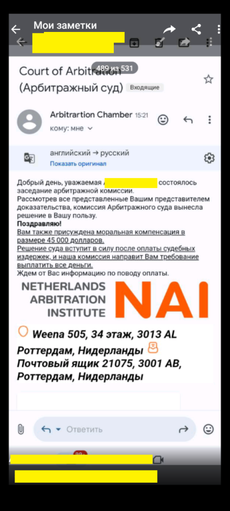 — «арбитраж» пишет, что вы уже выиграли и вам присуждена компенсация, но сначала платите издержки — классический приём advance-fee fraud;