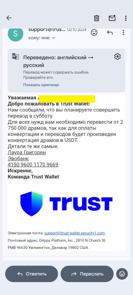 — «Trust Wallet» просит пополнить счёт переводом на карту физлица — это очень сильный красный флаг;