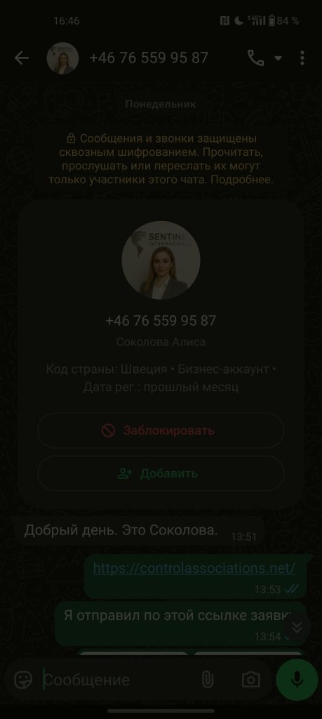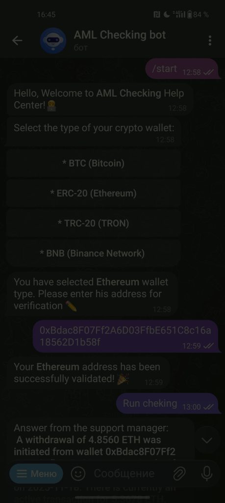 Здравствуйте. Роман Радлов @radlovr связался со мной через телеграмм по возврату средств от мошенников, позже по телефону +46 76 559 95 87 Соколова Алиса на фото в Ватсапп Sentinel international и сказала, после чего дала ссылку на бот @aml_checking_support_bot, чтобы я связался и отправил адрес 0xBdac8F07Ff2A6D03FfbE651C8c16a18562D1b58f. Где мне пришёл ответ с телеграмм бота: