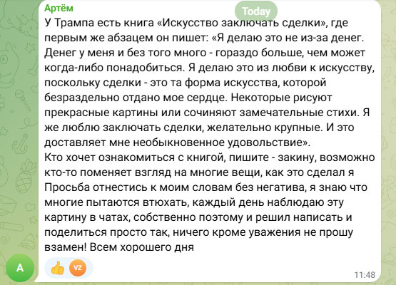 У Трампа есть книга «Искусство заключать сделки», где первым же абзацем он пишет: «Я делаю это не из-за денег. Денег у меня и без того много — гораздо больше, чем может когда-либо понадобиться. Я делаю это из любви к искусству, поскольку сделки — это та форма искусства, которой безраздельно отдано мое сердце. Некоторые рисуют прекрасные картины или сочиняют замечательные стихи. Я же люблю заключать сделки, желательно крупные. И это доставляет мне необыкновенное удовольствие».