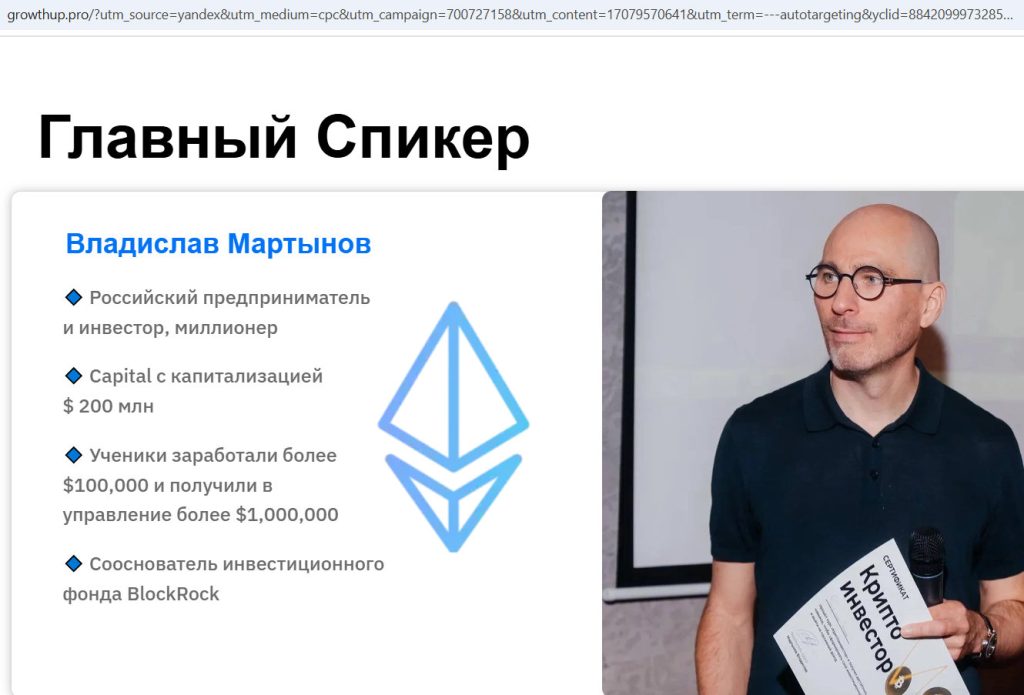 Владислав Мартынов представлен как Российский предприниматель и инвестор, миллионер; Capital с капитализацией $ 200 млн; «Ученики заработали более $100,000 и получили в управление более $1,000,000», «Сооснователь инвестиционного фонда BlockRock.