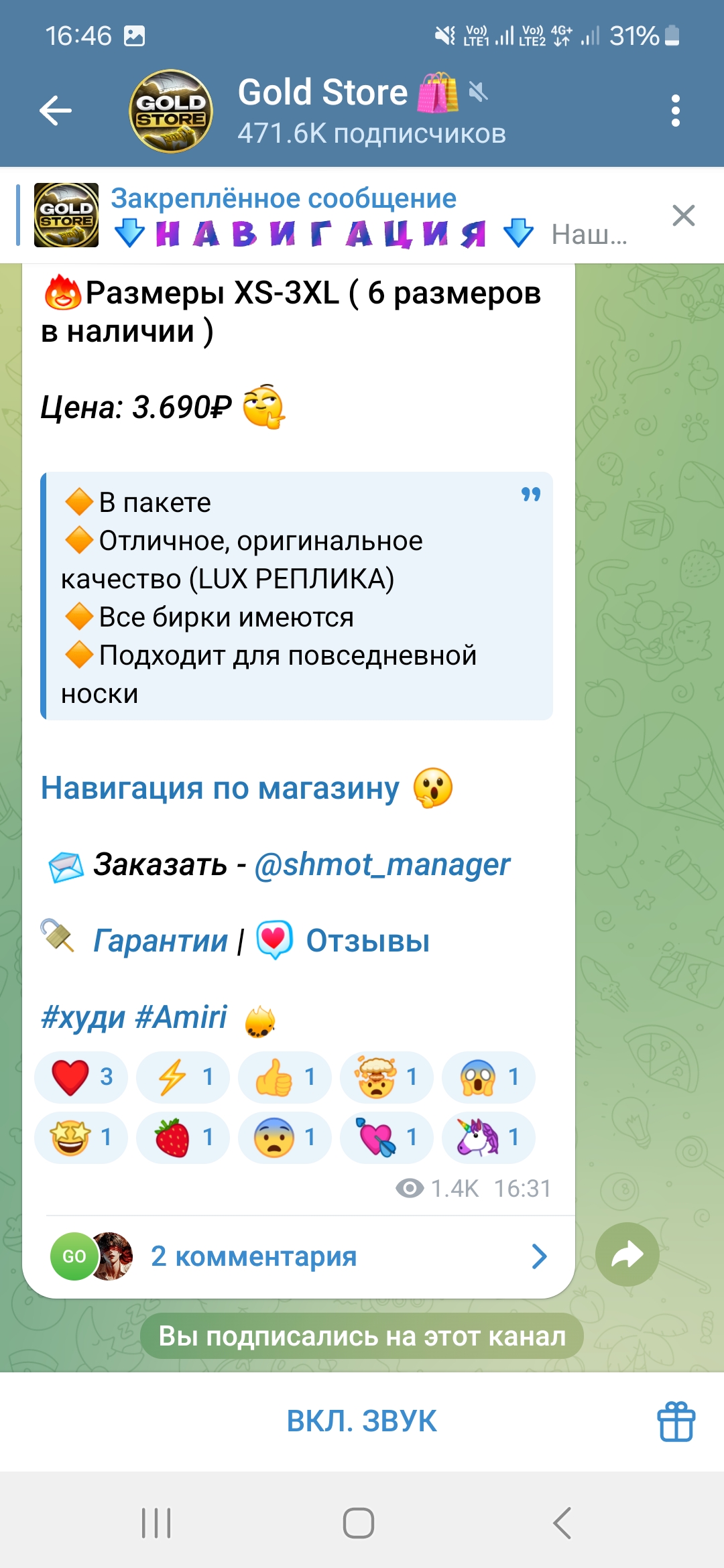 Нам поступают отзывы о появлении в Telegram канала Gold Store. В описании сказано, что это «магазин качественных реплик брендовой одежды и кроссовок».