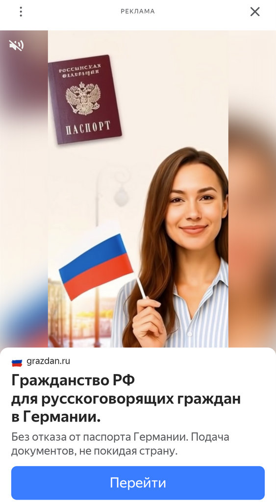 У нас в Германии показывают такую рекламу от рекламодателя ОБЩЕСТВО С ОГРАНИЧЕННОЙ ОТВЕТСТВЕННОСТЬЮ «ЦЕНТРАЛЬНОЕ АГЕНТСТВО МИГРАЦИИ», ИНН 9724130508, ID #111106035. Сайт grazdan.ru.