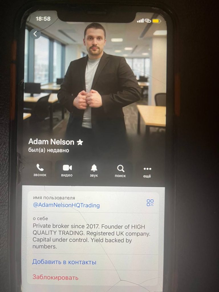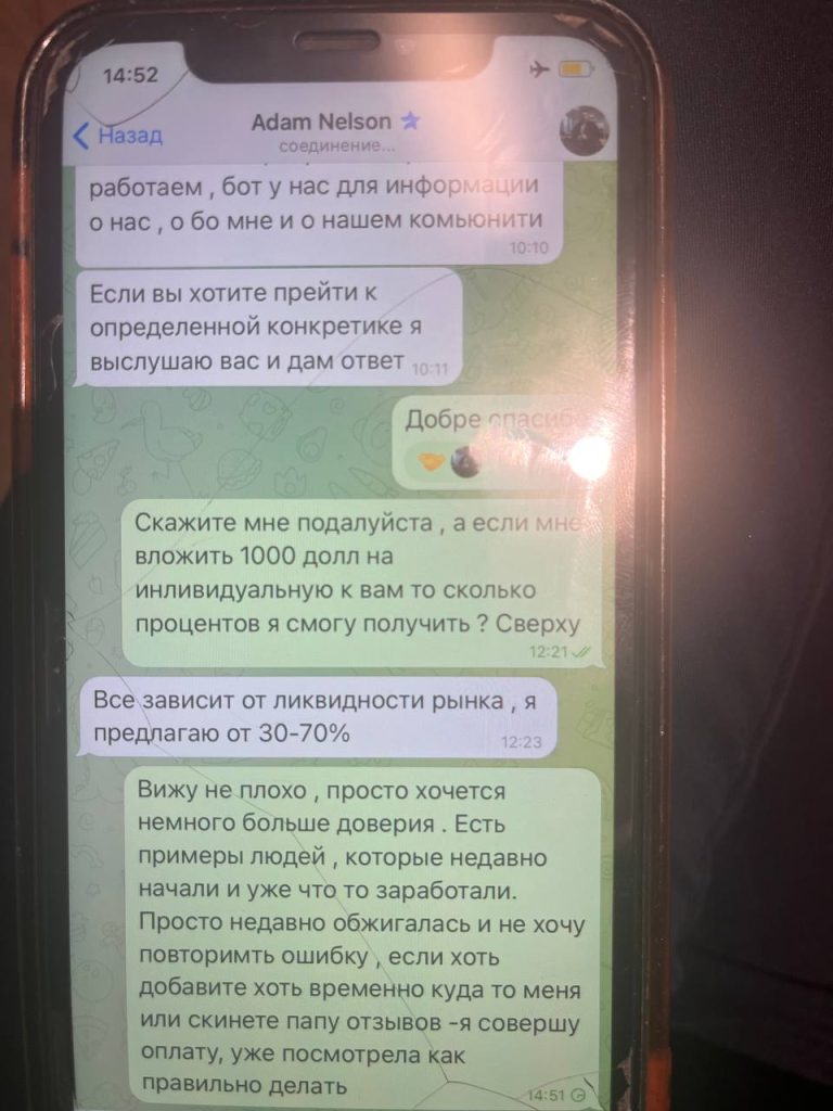 Сначала пишет аккаунт ко мне в личку, входит доверие. Ну он, конечно, от имени мужчины знакомится со мной. Завлекает, расспрашивает, обрабатывает в течение 2 недель. Потом, разговор доходит до того, что якобы он там зарабатывает там-то и там-то. Потом привлекают в группу, где якобы 800 человек участников. Там все аккаунты купленые и пишут и делятся ссылками, якобы это такая группа, как зарабатывают. Потом некий Адам Нельсон существует на рынке. С ними работают люди очень давно и долго. У меня есть очень много голосовых сообщений, когда я проверяла, прежде чем вступить в эту группу. Где-то человек 30 я спросила. Но теперь-то я понимаю, что это было всё купленное. У меня есть голосовые, у меня есть лица.