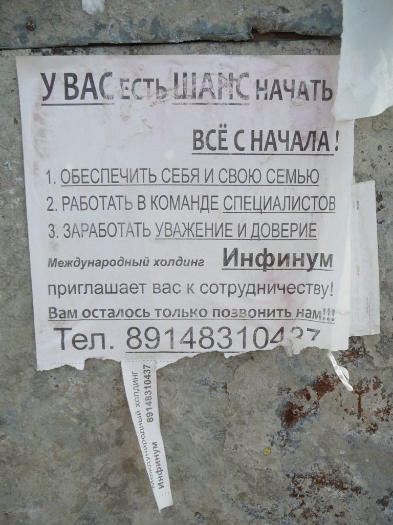 Это был низовой рекрутинг в MLM-сеть «Инфинум», то есть не нормальная вакансия, а приглашение стать консультантом/распространителем в системе прямых продаж. По стилистике объявления всё узнаваемо: «у вас есть шанс», «команда специалистов», «только позвонить», отрывные телефончики — типичная уличная вербовка в сетевой маркетинг конца 2000-х.