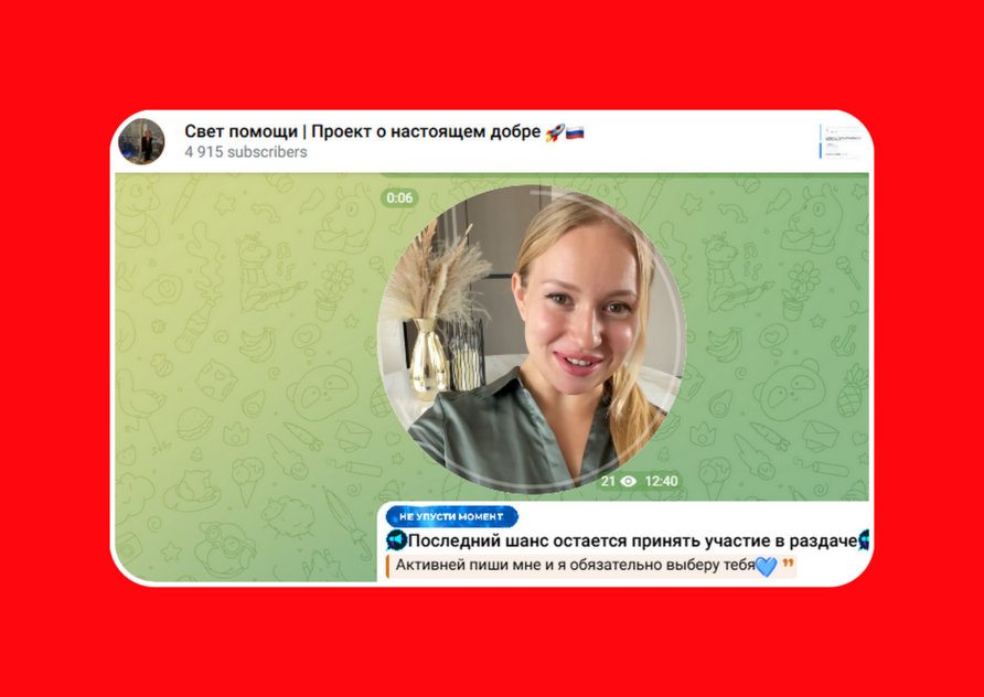 Уверяет, что каждый день помогает армии, публикует благодарные отзывы счастливых людей. Затем, ссылаясь на антифрод, вымогает людей для вывода им денег, перечислять ей сначала 1100р, затем 2100р, потом 5100р и так до тех пор, пока человек не поймет, что его обманывают.